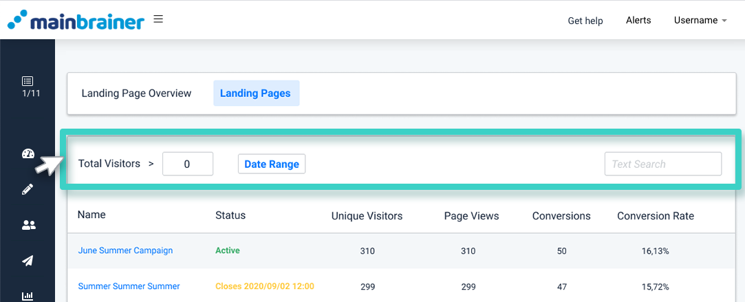 You can filter this list using the landing page name, the number of visitors received by the landing page, or the date range of landing page creation by using the fields highlighted in the screenshot below. Navigate to the desired landing page, and click the landing page name.